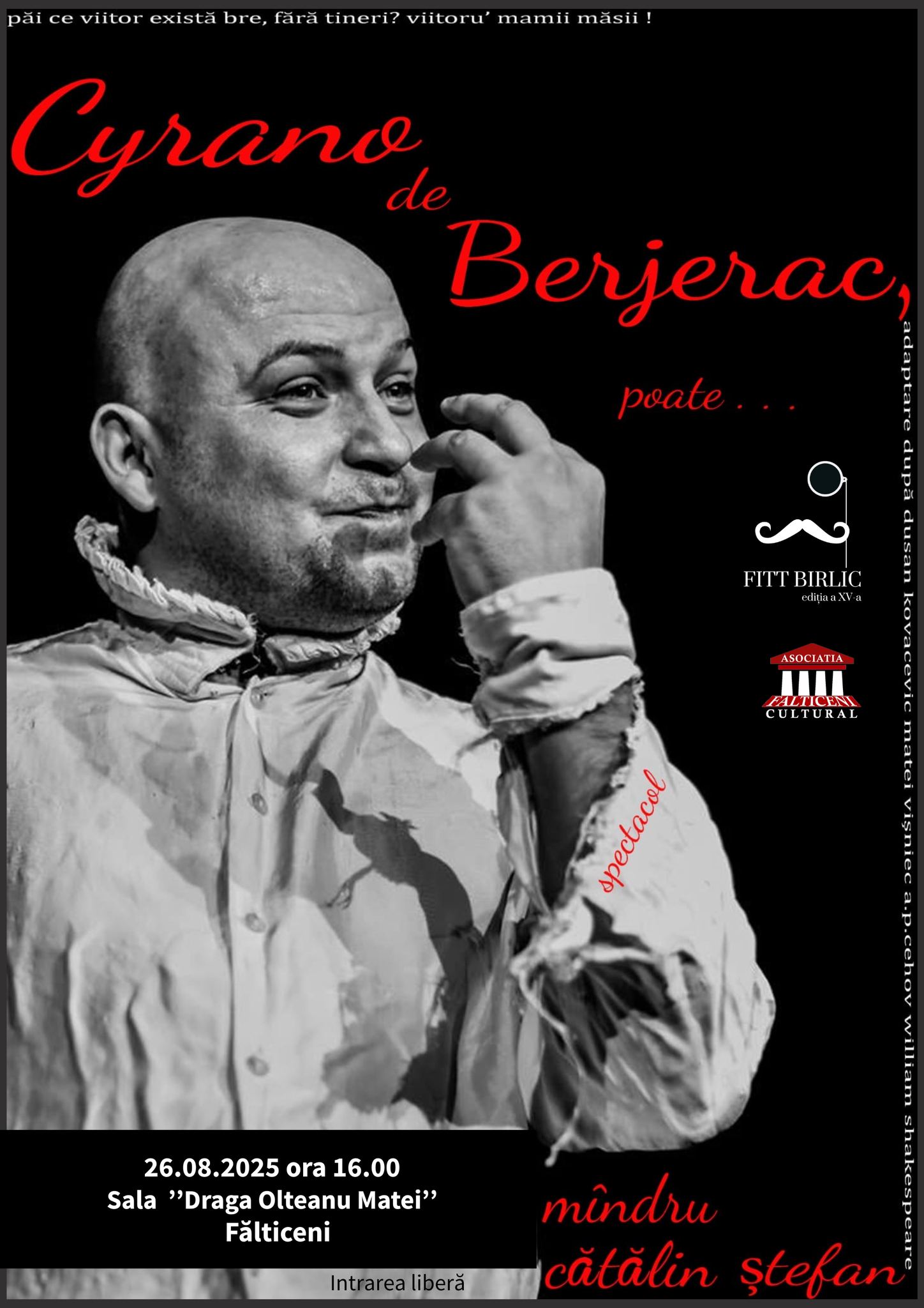 Asociatia Falticeni Cultural va invita marți 26 august 2025 de la ora 16.00 la Spectacolul de teatru “Cyrano de Bergerac, poate…” ce va avea loc la Sala Draga Olteanu Matei – Falticeni in cadrul celei de-a XV-a editii a FITT Birlic.