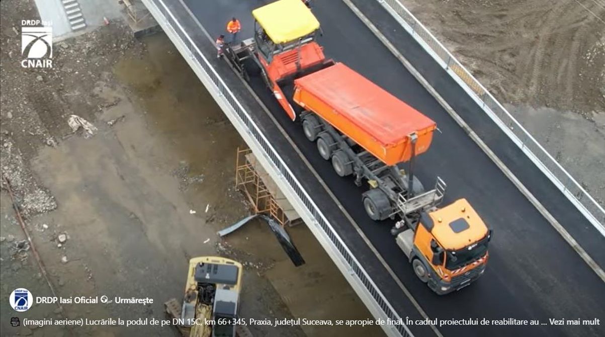Reabilitarea podului de pe DN 15C, în zona Praxia (km 66+345), județul Suceava, intră în etapa finală. Direcția Regională de Drumuri și Poduri Iași anunță că lucrările au depășit 90% progres fizic, după ce, la sfârșitul săptămânii trecute, au fost așternute straturile de mixtură asfaltică pe pod și pe rampele de racordare.