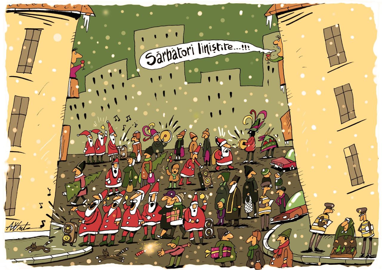 Perioada sărbătorilor de iarnă este, în imaginarul colectiv, asociată cu liniștea, bucuria și armonia. Totuși, realitatea urbană contemporană oferă adesea o imagine mult mai nuanțată, uneori chiar contradictorie. Această tensiune dintre ideal și cotidian este surprinsă cu ironie fină în cea mai recentă lucrare a caricaturistului fălticenean Doru Axinte.