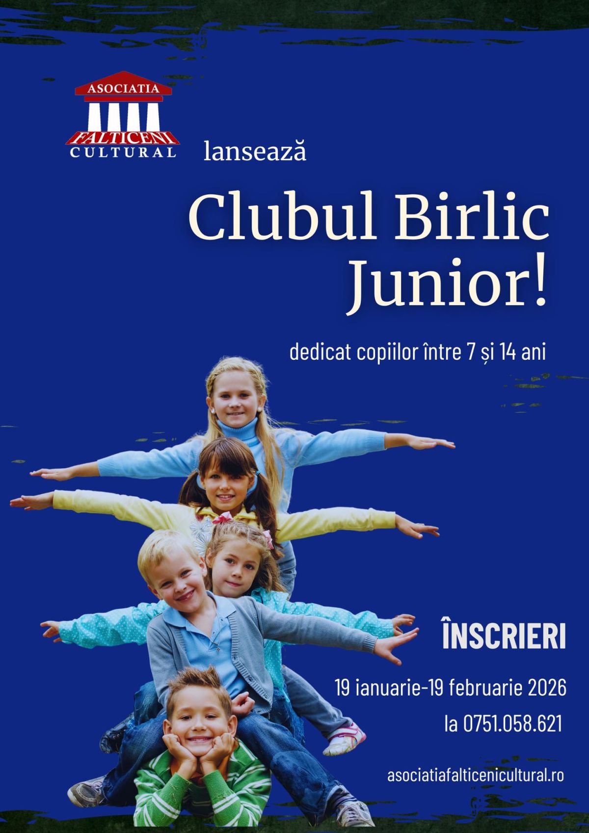 Asociația Fălticeni Cultural anunță lansarea Birlic Junior, un club de teatru dedicat copiilor cu vârste între 7 și 14 ani. Activitățile vor începe în martie 2026, la Sala „Draga Olteanu Matei” din Fălticeni, iar înscrierile sunt deschise până pe 19 februarie.